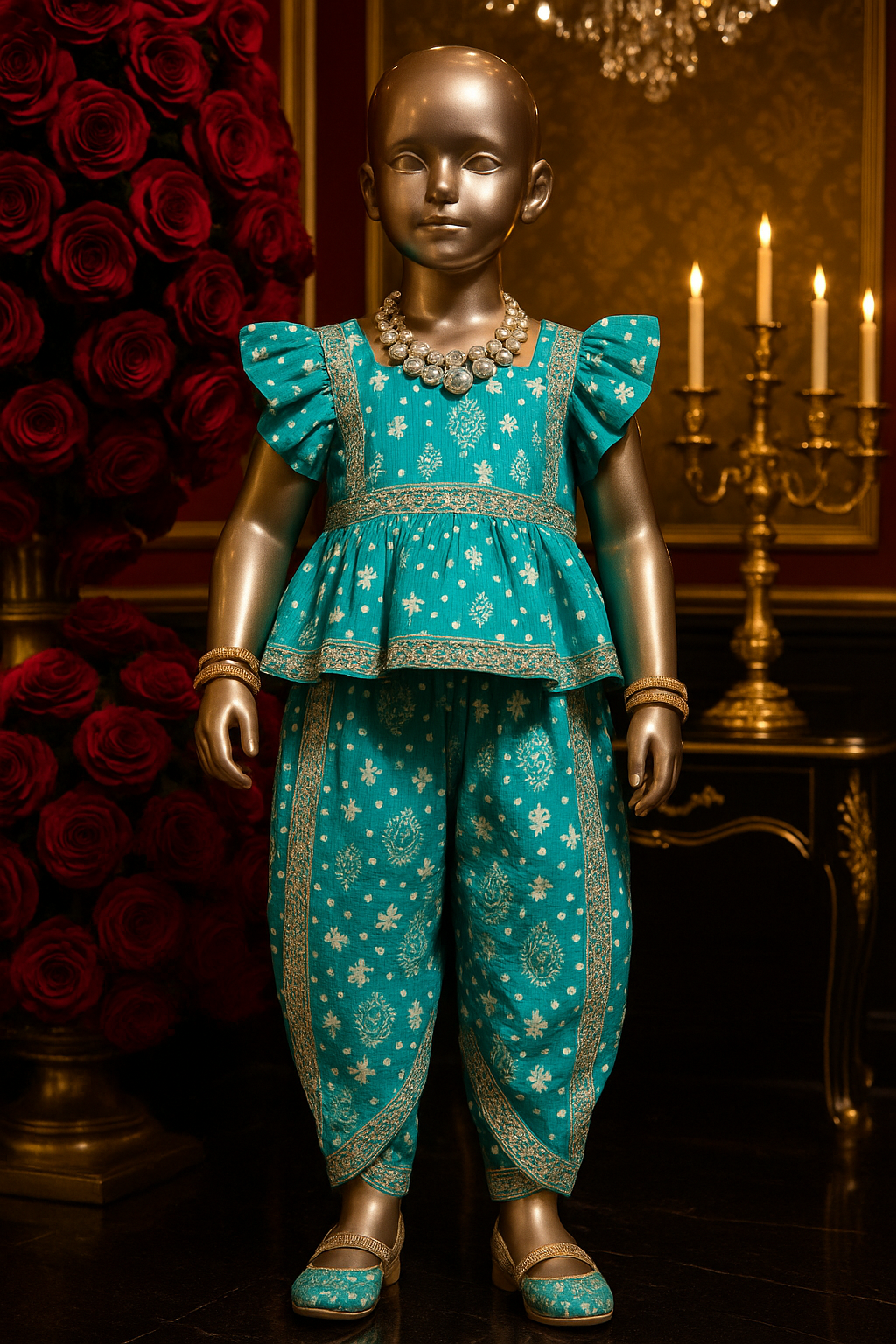 Introducing our exquisite Kids Indian Ethnic Wear, featuring Kurti Tops with Dhoti Pants, a must-have ensemble for your little one. Available in two stunning colors, Emerald Green and Dark Red, each outfit is adorned with contrasting gold lace that adds a touch of elegance and charm.