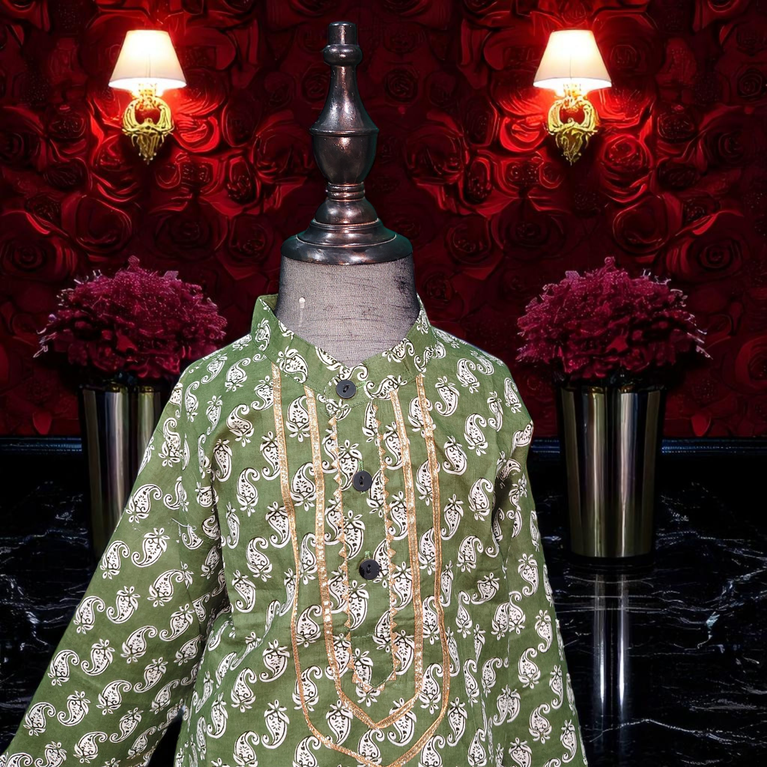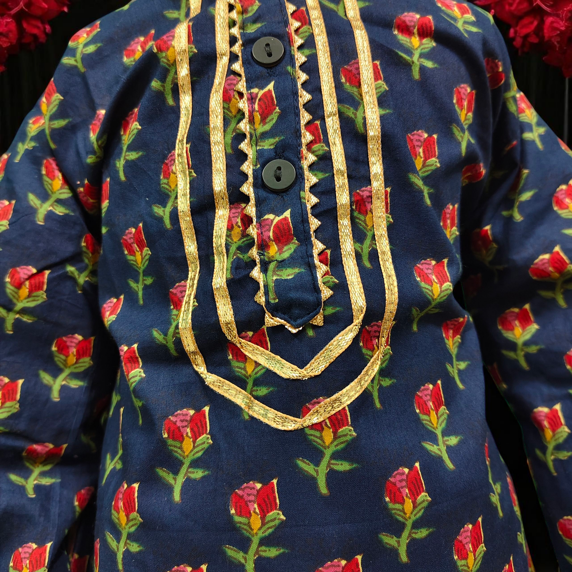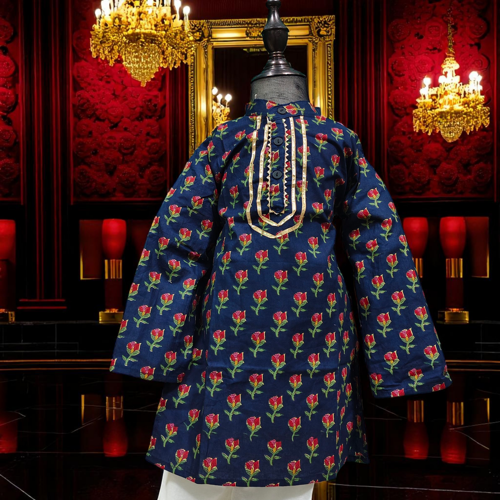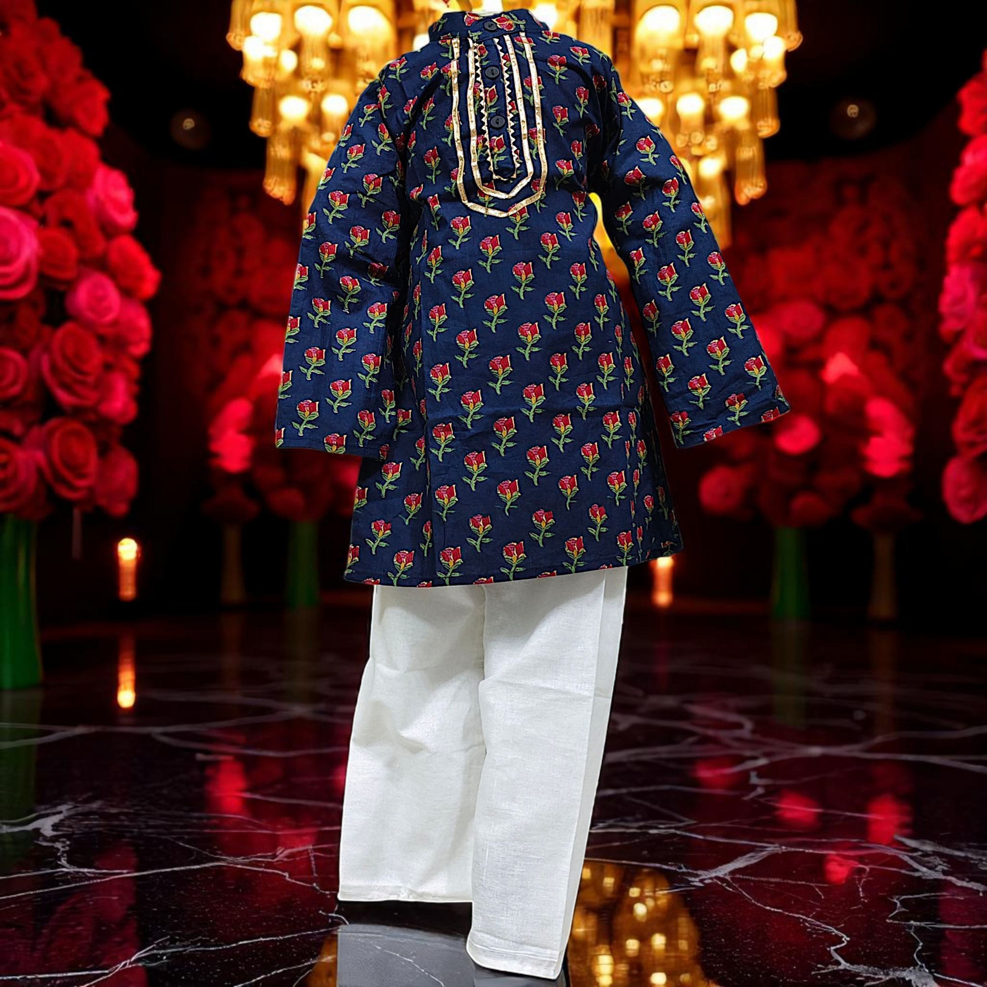 Dress your little one in timeless elegance with our Premium Kids Kurta & White Pyjama Set, crafted from soft, breathable cambric cotton for all-day comfort. Available in five stunning colors — Dark Blue Floral Vines, Dark Blue Button Rose, Elephant White, Dark Red, and Sage Green — this set combines tradition with a modern festive flair.
