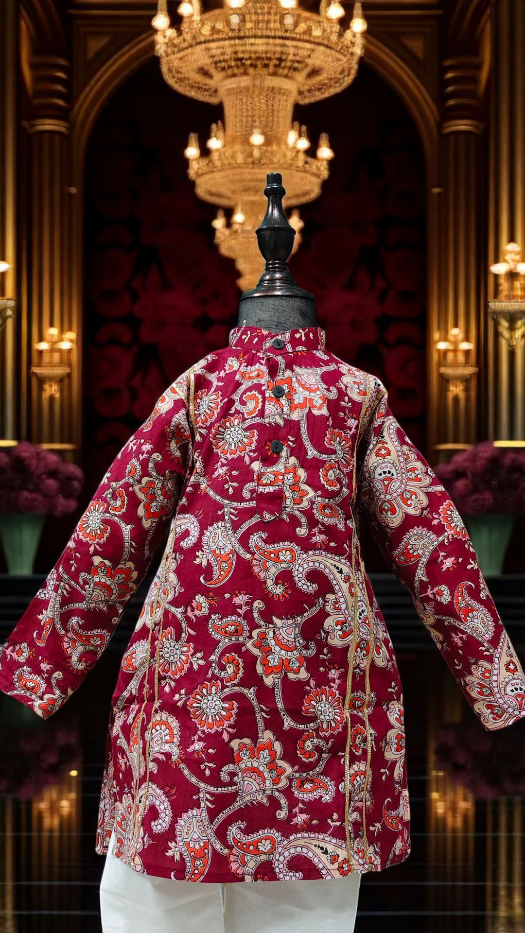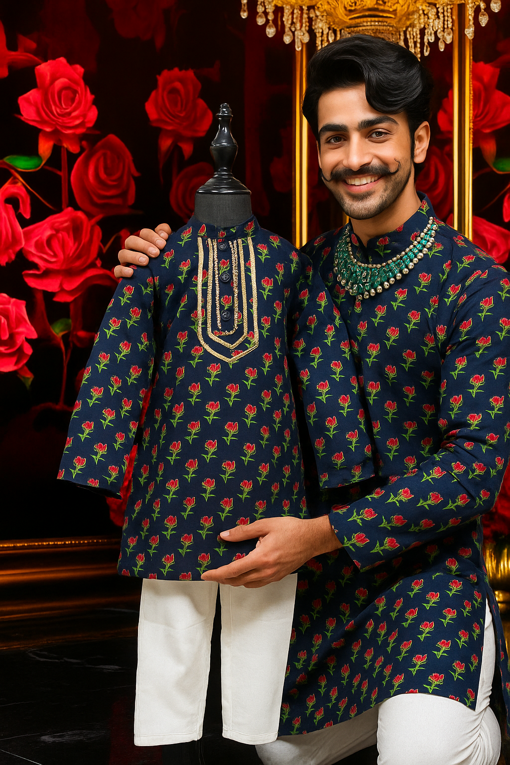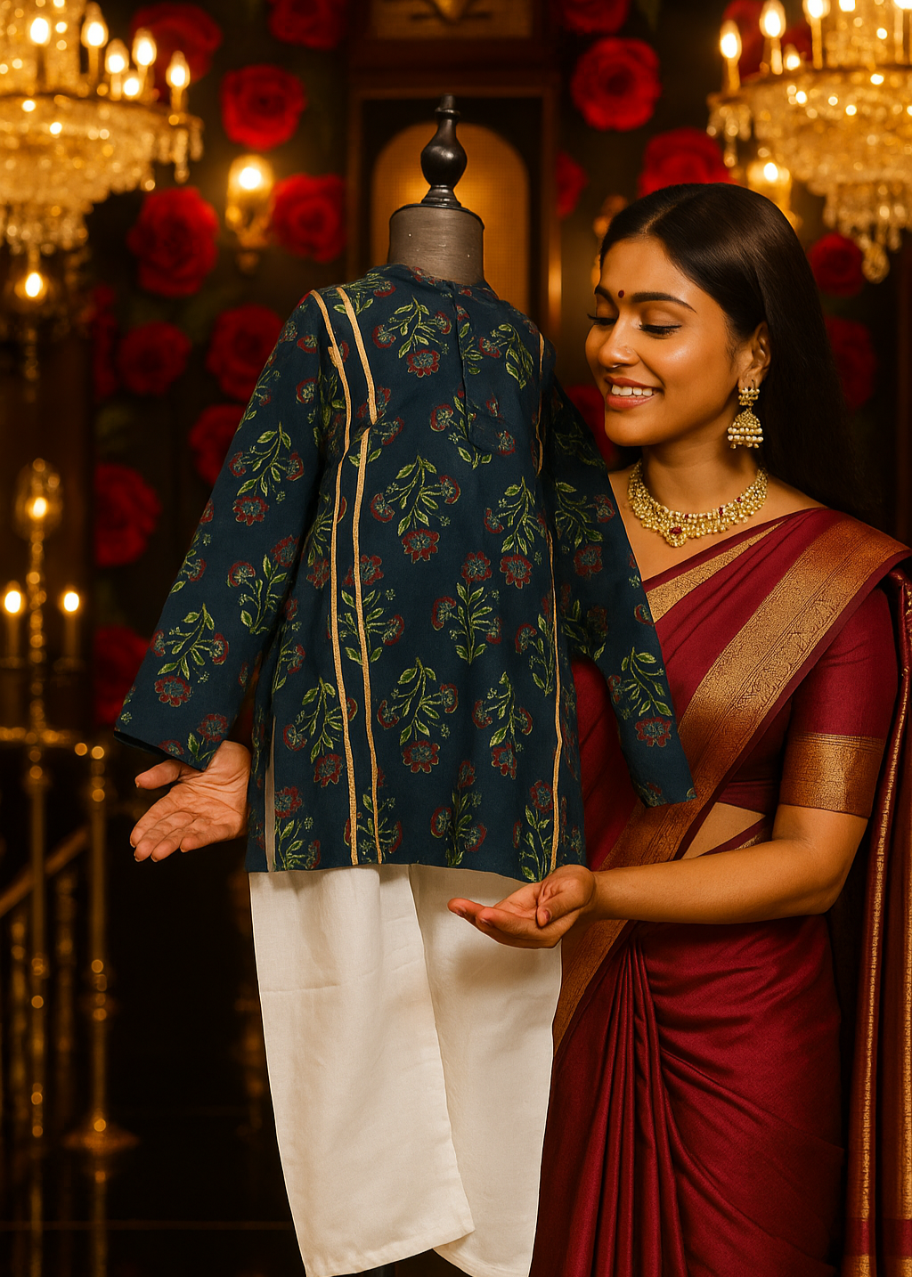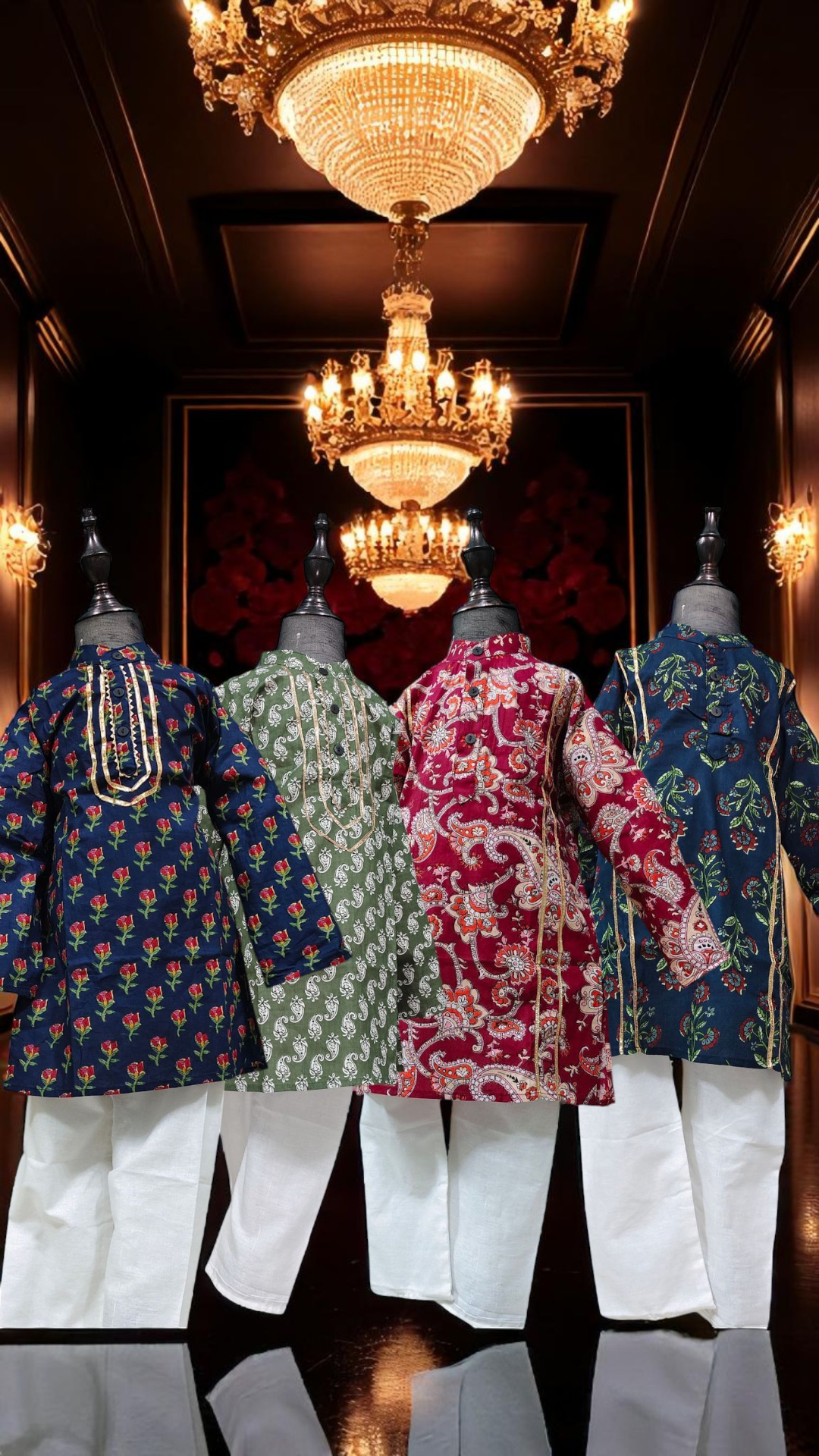 Dress your little one in timeless elegance with our Premium Kids Kurta & White Pyjama Set, crafted from soft, breathable cambric cotton for all-day comfort. Available in five stunning colors — Dark Blue Floral Vines, Dark Blue Button Rose, Elephant White, Dark Red, and Sage Green — this set combines tradition with a modern festive flair.
