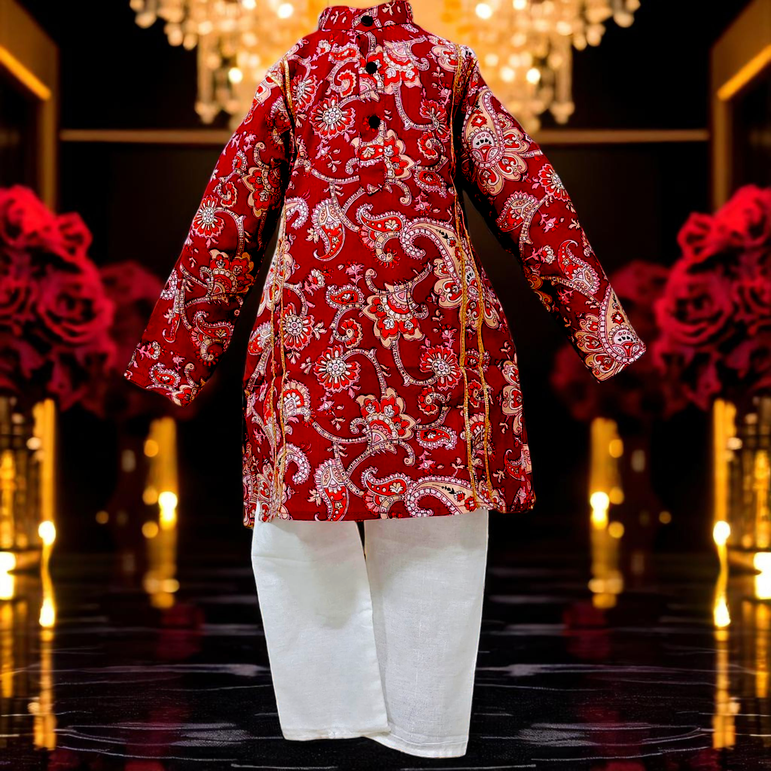 The long-sleeve kurta features exquisite golden lace detailing, either as delicate accents on the front chest area or elegant double-stitched gold stripes running down each side, adding a touch of regal charm. The elastic-waist pyjama pants offer a comfortable, flexible fit for active kids, making this set perfect for festive occasions or special celebrations.